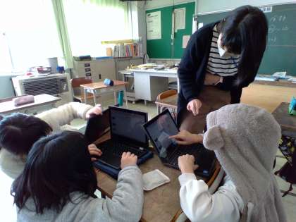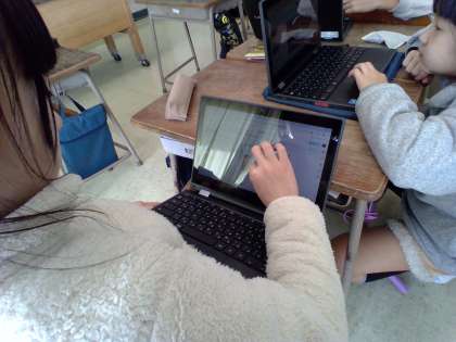 4年生 総合の学習 公開日 2024/02/27 更新日 2024/02/27 4年生 総合で学習したことを発表するために、みんなで動画を撮って編集したり、スライドを作ったりしました。撮った動画を見直したり、どのポスターを入れるか考えながら手際よく作っていました。