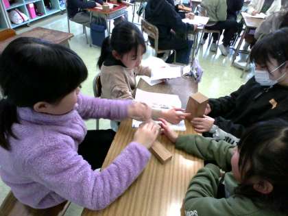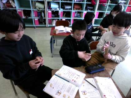 直方体や立方体を実際に触りながら、辺、面、頂点の数を整理しました。