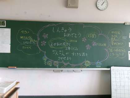 新学期が始まり、2年生に進級しました。始業式では、校長先生から、明日入学してくる新しい1年生のすてきな上級生になるようにと励まされました。教室に入り、今年1年間の学校生活で楽しみにしていることを話し合いました。夢が膨らむみんなの笑顔がいっぱい輝きました。
