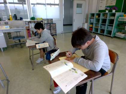 国語科は、詩の試写を丁寧にしました。その後、教科書の挿絵を見ながら、絵もかきました。
