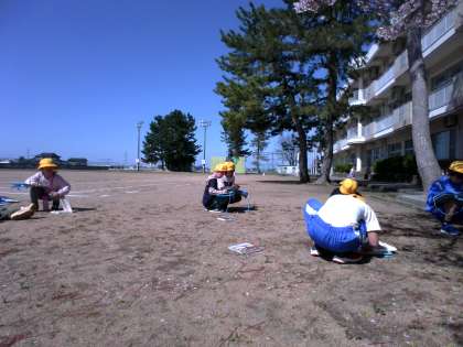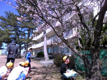 心地よい風が吹く中、2年生は春を見付けに外に出ました。青い空に美しく映える桜、小さな花を付けている雑草、1年生のために去年植えたチューリップ等が、春を祝うように校庭を彩っているのを見つけ、夢中でスケッチをしました。暖かい春を肌で感じることができました。