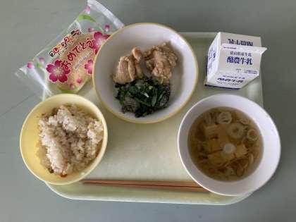 4月17日の給食 公開日 2024/04/17 更新日 2024/04/17 メール用カテゴリ 今日の給食は ちらし寿司 すまし汁 とりにくのからあげ ごまあえ お祝いデザート(いちごクレープ) です。 今日は入学祝い献立でした。 今日もおいしくいただきました。