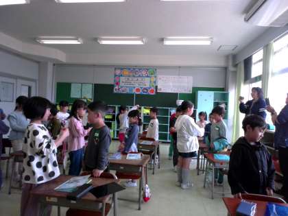 1年生の入学を全校で祝うために、集会を開きました。2年生はプレゼントのメダルを作り、1年生の教室に届けに行きました。「今日の集会、楽しみにしてね」「集会にはこのメダルをかけて来てね」など、一言ずつ声をかけて、プレゼントを渡しました。1年生がうれしそうに「ありがとう」と笑うのを見て、「がんばって作ってよかったな」と、2年生もうれしそうでした。