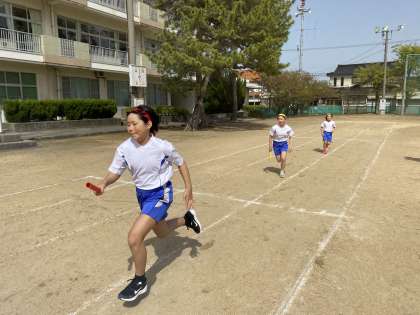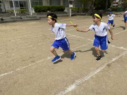 今年度、新しく決まった色団のメンバーでリレーを行いました。今日の目当ては「かっこよくバトンをつなぐ」でした。子供たちはバトンをもらう手の位置を確認し合ったり、タイミングよく声をかけ合ったりしながら、一生懸命練習に取り組んでいました。