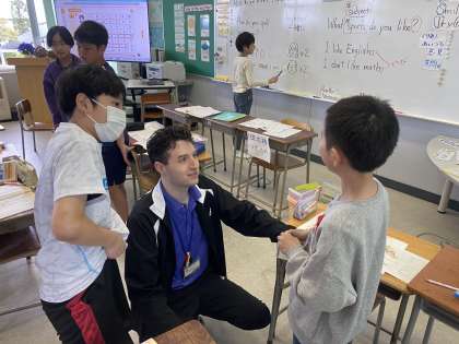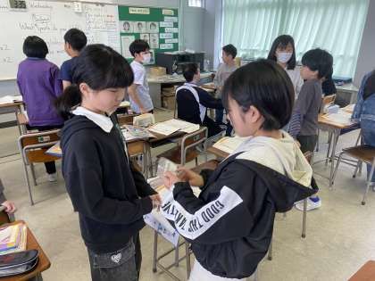 外国語科の時間に、自分の名前のつづりをアルファベットで紹介し合いました。いろいろな友達と楽しく交流する姿が見られました。