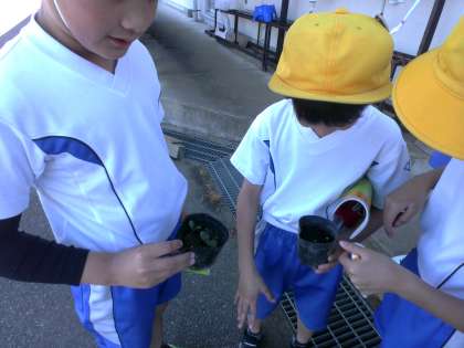 4年 理科 ヘチマの観察 公開日 2024/05/10 更新日 2024/05/10 4年生 4月に植えたヘチマの観察をしました。「朝に見たときよりも大きくなっていた」や、「もう少しで芽が出そう」などの声が聞こえました。暑い日が続いていきますが、大きく育つように水やりや植え替えをしていきます。