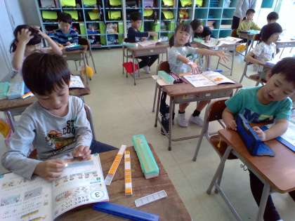 「あわせていくつ」を学習しました。算数ブロックを使って、実際に並べて確認していました。