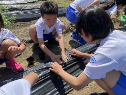 子供たちはプチトマト、オクラ、大豆の3種類の苗を植えました。たくさん収穫できるように、しっかり世話をしていきたいと思います。