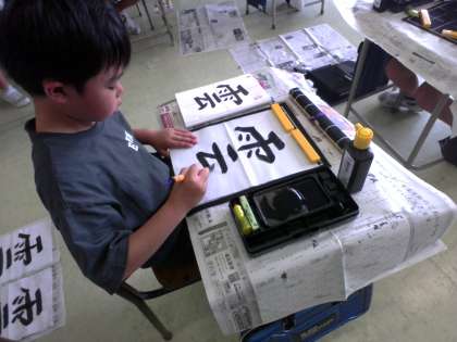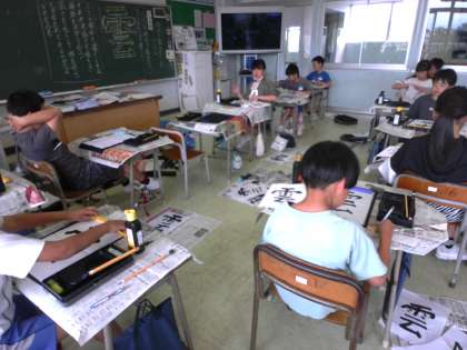 書写の学習で毛筆をしました。上下の漢字の形に気をつけながら練習することができました。