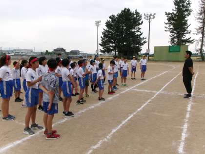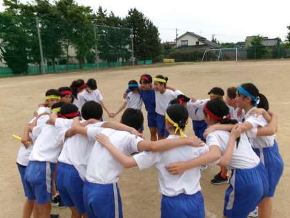 運動会に向けて取り組んできたリレー学習の成果発表の場として、学年対抗のリレー大会を行いました。大会前には、円陣を組んで気合いを入れていました。