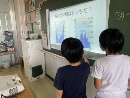 5年生 富山県と沖縄県を比べよう 公開日 2024/05/28 更新日 2024/05/28 5年生 社会科の時間に、富山県と沖縄県の暮らし方の違いについて学習しました。沖縄県では1月に桜が開花したり、3月に海開きがあったりと、自分たちの暮らす富山県と違う生活の仕方があることを知り、みんな興味をもって話合いに参加していました。