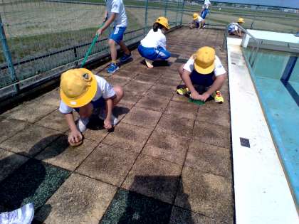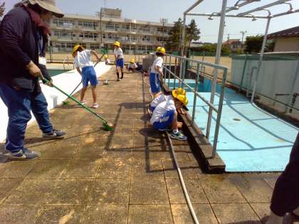 1、2、3年生でプール清掃をしました。プールの周りの草むしりや、プールサイドをたわしでこすり、汚れを取ってくれました!きれいになって、プールに入るのが待ち遠しいですね。