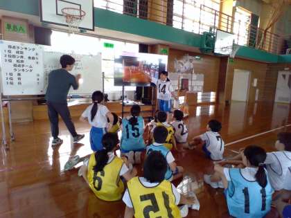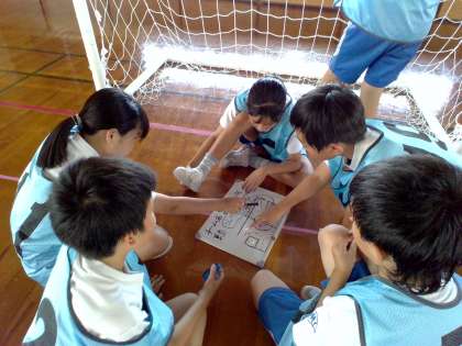 ハンドボールで、映像を見ながら空間の使い方の上手な友達の動きを確認しました。どんな動きをしたらパスをうまくつなげられるか、どこに動いたらパスしやすいか、みんなで考えました。空間の使い方を意識して、作戦を立て、試合していました。