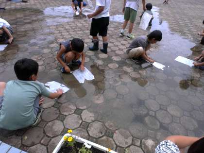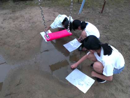 理科の学習で、水たまりはどこにできるのかについて考えました。子どもたちと予想をし、実際に確かめました。