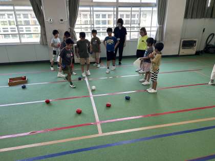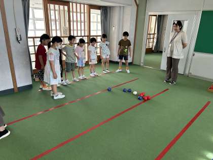 今日は、昨年度、6年生が中心に全校みんなで作ったボッチャを使って仲を深めました。