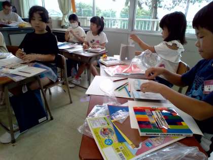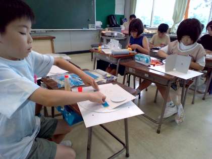 円形の回転する画用紙を使って、工作しました。場面を切り替えた絵を描いたり、時計として使ってみたり、工夫して作っていました。