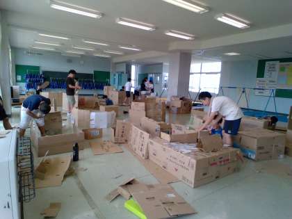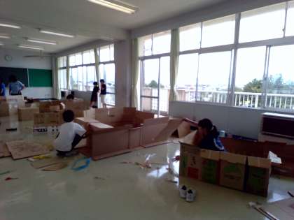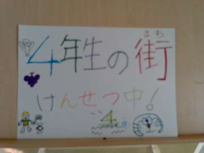 段ボールを使って、「4年生の街」を建設中です。工夫をこらして、いろんな形の家にしたり、表札にこだわって作っていました。
