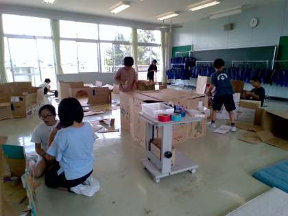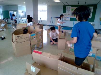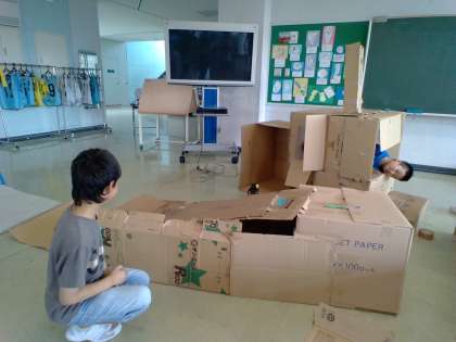 「4年生の街」建設中です。タフロンテープをリボンにしてつけてみたり、飾りにもこだわって素敵な街になりそうです!