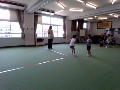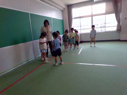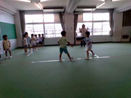 「みんなで遊ぼう」の中から、どんじゃんけんをして遊びました。ルールを守ってみんなで遊ぶことを楽しんでいましたよ。遊んでいく中で「勝った!負けた!」と声を出さないと次の人が走り出せないね、と話し合っていましたよ。