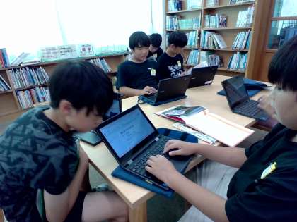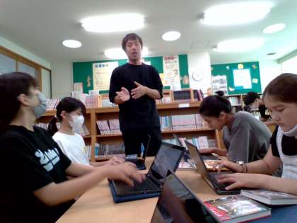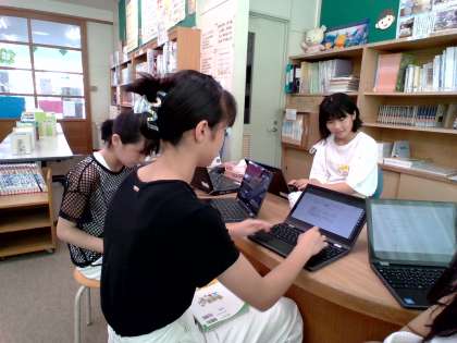 「おすすめの本」の紹介を作っています。相手にわかりやすく伝えるにはどうしたらいいか考えながら作っていました。おすすめポイントや好きなところを書き出したり、先生から話をアドバイスをもらって書き直したり、付け足したりしていました。