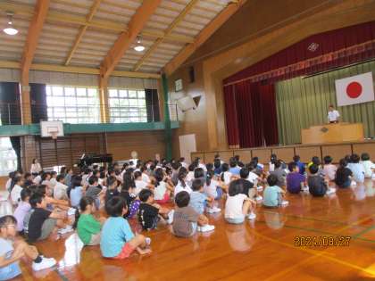 2学期始業式を行いました。校長先生からは、2学期は「聞く力」をつけていきましょうという話がありました。「ただ聞く」のではなく、「過去の話や経験をつなげてこれからの自分に生かしていくなど考えながら聞く力」を身に付けることができるよう、子供たちと取り組んでまいります。