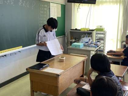 夏休み中に取り組んだ自由研究を発表し合いました。子供たちは「調べようと思ったきっかけ」や「調べてみて分かったこと」等を分かりやすく説明していました。友達のがんばりを共有することができた有意義な時間になりました。