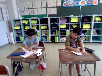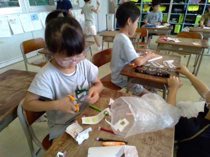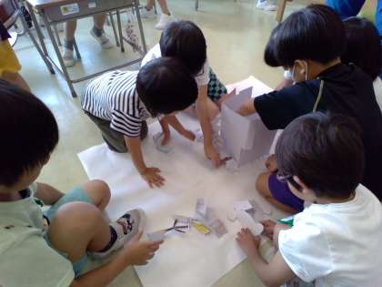 1年生 図工の学習 公開日 2024/09/04 更新日 2024/09/04 1年生 画用紙で作ったみんなの作品を集めていました。「私も作るー!」と追加で作り出したり、みんなの作品で小さな町を作り始めていました。