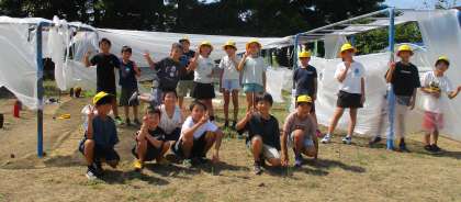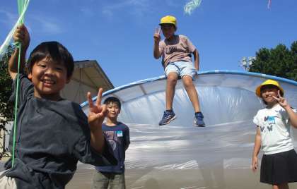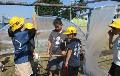 図画工作科の時間では、ビニールを使い校庭にある遊具を包みました。ビニールやひもで包みながら、新たな遊具をつくるなどし、楽しく学習を進めました。