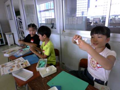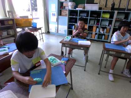 2年生 図画工作科「にぎにぎねんど」 公開日 2024/09/06 更新日 2024/09/06 2年生 粘土のかたまりをぎゅっと握って手を開くと、面白い形が出てきます。握って引っ張ったり、穴をあけたり、指で押したりしてできた形を楽しみながら、いろいろなものを作りました。