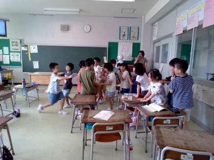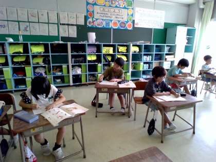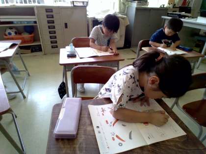 今日も楽しく書写の時間を過ごしました。思いきり体操をしたあとは、真剣に字を書いていました。