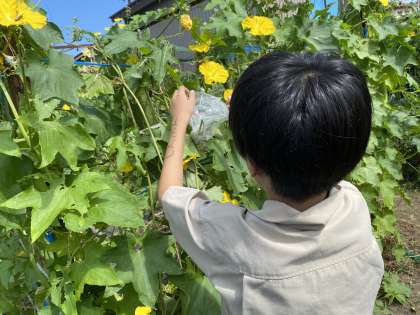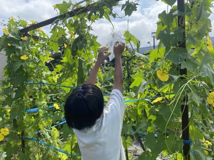 理科の時間に「植物の成長」について学習しています。今日は「実ができるためには受粉が必要なのか」についてクラスで話し合い、実際に実験をして調べてみることになりました。受粉したヘチマと、そうでないヘチマが、今後どのように育っていくかが楽しみです。