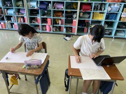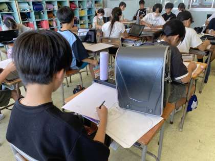 5年生 立体物を描く 公開日 2024/09/11 更新日 2024/09/11 5年生 図工の時間にランドセルを描いています。子供たちは立体的に見える構図を工夫したり、縫い目などの細かい部分を丁寧に書き表したりしています。どのような作品に仕上がるのかが楽しみです。