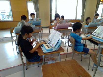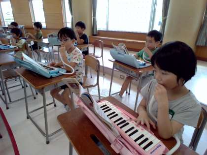1年生 音楽の学習 公開日 2024/09/13 更新日 2024/09/13 1年生 鍵盤ハーモニカをしました。指を置いたまま、長く伸ばす音や短い音を弾きました。息を長く入れたり短く切ることが難しそうでしたが、コツを掴むと上手にできていました。