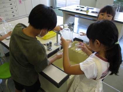 4つのペットボトルの水のかさをくらべました。友達と協力しながら、コップに何倍分かを調べ、グループの結果を発表しました。数が違うことに驚き、もう一度調べ直して、水のかさの多い順がわかりました。
