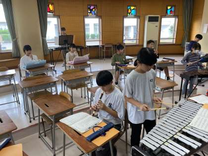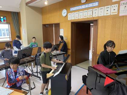 朝の自主活動の時間に「器楽合奏」の練習をがんばっています。自分の苦手な部分を繰り返し演奏したり、他のパートの友達と一緒に合わせたりしながら、今の自分に必要な練習を考えて活動しています。本番では、堂々とした演奏ができるようにがんばります!