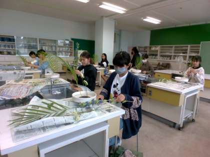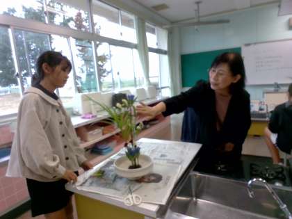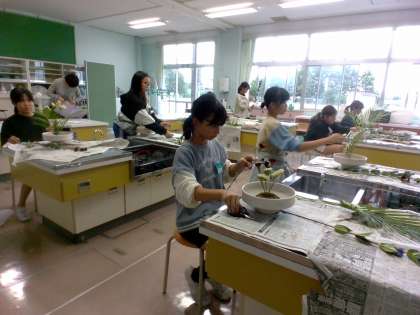 今日のクラブでは、「アレカヤシ、リンドウ、スプレーカーネーション、スターチス」を生けました。「飾る場所やどの花を主役にするのかを考えながら、生けてみるといいですよ」とアドバイスをしていただきました。