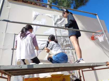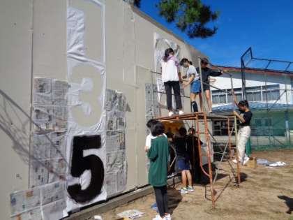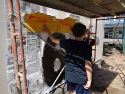 6年生 スポーツボードづくり 公開日 2024/10/16 更新日 2024/10/16 6年生 総合的な学習の時間での活動が進んでいます。グラウンド西側のボードを「スポーツボード」と名付け、みんなの遊び場になるように作成しています。スプレーでの色づけ等、初めてやる体験を楽しんでいました。