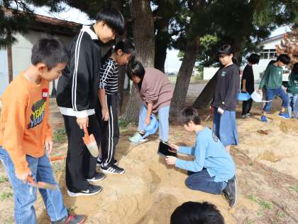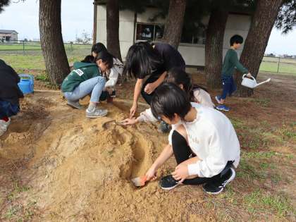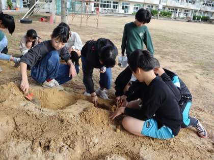 5年生 流れる水のはたらき 公開日 2024/11/04 更新日 2024/11/04 5年生 理科の時間に、グラウンドの砂山に人工的な川をつくり、実際に水を流すことで「侵食」「運搬」「堆積」のはたらきを確かめました。実際にやってみることで、流れる水のはたらきについての理解が深まりました。