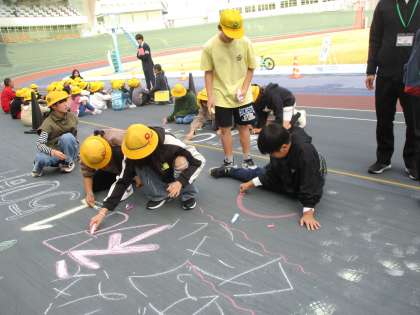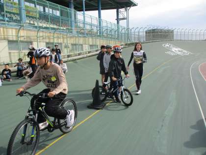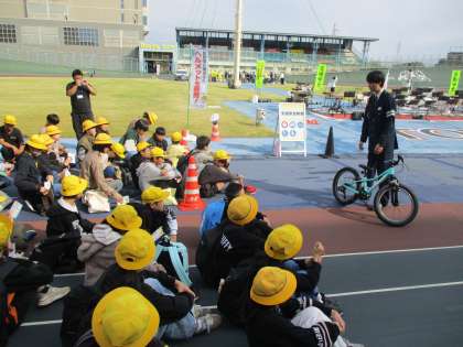 全校で富山競輪場に行き、普段はなかなかできない体験をたくさんしてきました。子供たちはもうすぐ改修工事が行われるバンクに自由に絵を描いたり、自転車を走らせたりなど3種類の活動を行いました。また最後には本物競輪選手や白バイの方に実際のバンクで走行していただき、55キロから110キロまでの迫力の走りを真近で見る体験をしました。