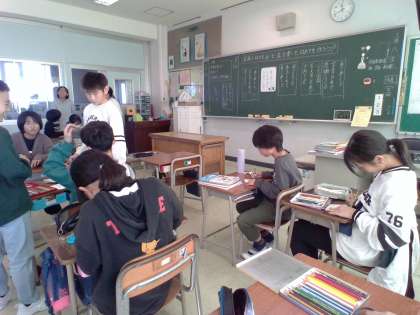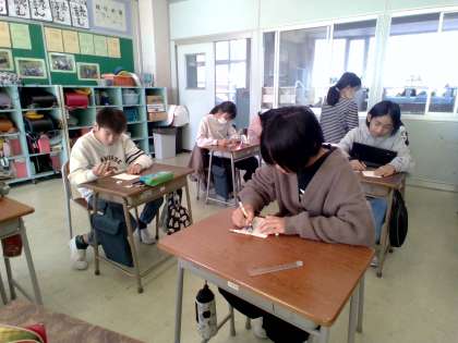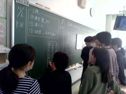 5年生 校外学習の準備 公開日 2024/11/08 更新日 2024/11/08 5年生 校外学習でドラえもんポストに投函するはがきを書きました。5・7・5になるように指で数えながら家族に向けて一生懸命考えて書いていました。選べるように見本も考えて、黒板に書き出してくれるお友達もいました。