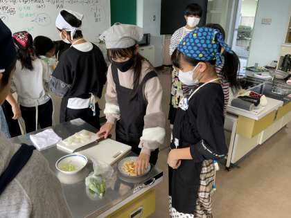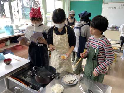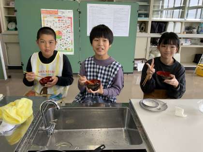 5年生 調理実習(みそ汁) 公開日 2024/11/13 更新日 2024/11/13 5年生 家庭科の調理実習でみそ汁をつくりました。班の友達と協力しながら具材を切ったり、みそで味を調えたりしながら、満足のいくみそ汁に仕上げていました。前回はご飯を炊く調理実習だったので、「ご飯」と「みそ汁」の両方をつくることができます。ぜひ、学んだ知識や技能を生かして、朝ご飯づくりにチャレンジしてほしいと思います。
