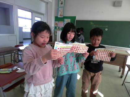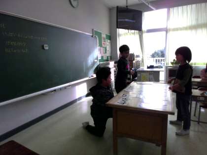 2年生は今、かけ算の学習をしています。九九をすらすらになるまで練習しています。今日は友達とかけ算対決をしました。勝負に負けた子は次回の勝利に備えて、勝った子もさらに強い相手に勝負を挑むために、トレーニングタイムに練習をしました。一人でカードをめくって練習する子、審判をし合って模擬戦をする子、学習アプリを使って練習する子、九九表を見ながら友達と声を合わせて練習する子。方法や相手、道具を選んで次回の対決に向けて練習を進めました。