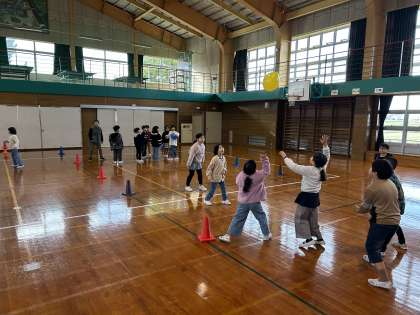 2つの班ごとに分かれて、風船を落とさないように協力して活動していました。