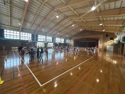 1〜3年生が楽しくふれあうことができるように、風船バレーを企画しました。