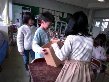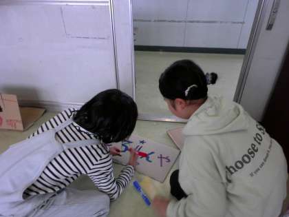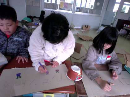 先週作った動くおもちゃで、お互いに遊び合おうと、おもちゃまつりをすることにしました。同じおもちゃを作った人とグループになっておもちゃ屋さんを作り、営業の準備を始めました。