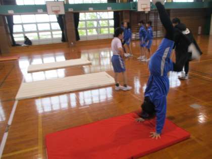 6年生 体育科「チャレンジ!マット運動」 公開日 2024/11/27 更新日 2024/11/27 6年生 小学校6年間の体育科学習の集大成を目指し、マット運動に取り組んでいます。 同じ種目にチャレンジしている子はもちろんですが、怪我をして運動できない子も、仲間に動きのポイントを伝える姿があります。みんなでがんばる雰囲気がすてきだと感じます。