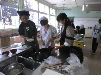 調理実習で「味噌汁」をつくりました。今回は自分たちの班で決めた、好きな具材を持ち寄り、オリジナルの味噌汁づくりに挑戦しました。どの班も手際よく作業を進めていました。