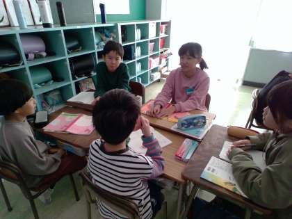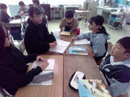 国語の時間に話合いの活動をしています。クラス全体での話合いに向けてグループで話合いの練習をしています。クラスみんなで成功できるよう進めていきます。