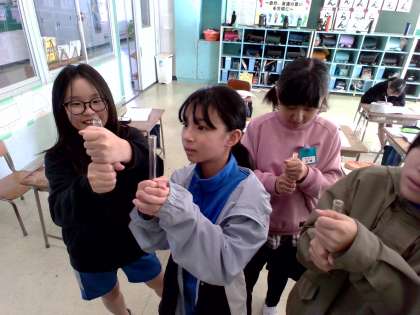理科の学習で、せっけん水のまくをはった試験を手であたためる活動をしています。まくがふくらむことにおどろき、予想を立てました。