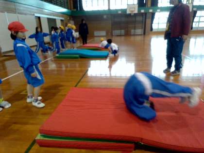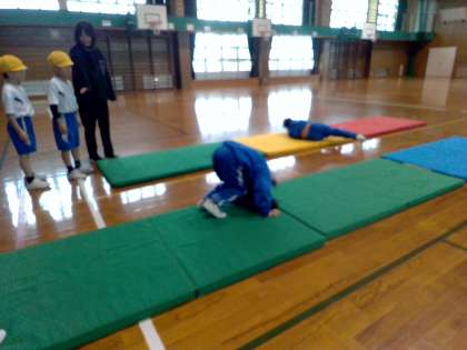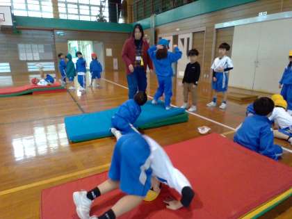 マット運動をしています。前転と後転を頑張っています。手のつき方が難しいですが、何度も考えながら挑戦していました!
